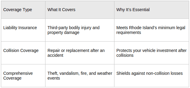 Auto insurance coverage types define which risks your policy assumes and which you retain. Beginners benefit from understanding core options that Rhode Island law either mandates or strongly recommends for complete financial protection.